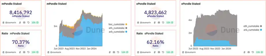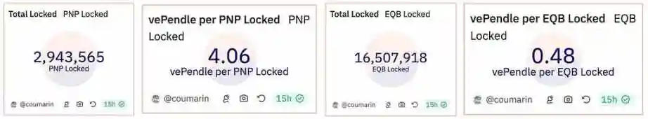 上图跟踪了 PNP 和 EQB 锁定在 Penpie 和 Equilibria 上以及他们对 Pendle 治理代币 (vePendle) 的所有权。这显示了 vlPNP 和 vlEQB 持有者对 Pendle 协议的控制水平。vlPNP 和 vlEQB 持有者指导 Pendle 的 vePendle 在治理提案和衡量权重投票上的分配。