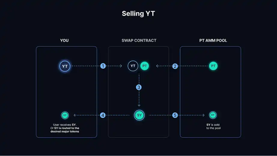 Pendle 创新性的将收益资产代币化成 SY 代币,其根据 ERC-5115: SY Token 标准进行的代币化,如将 stETH 包装成 SY-stETH,之后 SY 被分为其本金和收益成分,分别为 PT(Principal Token,本金代币)与 YT(Yield Token,收益代币)。