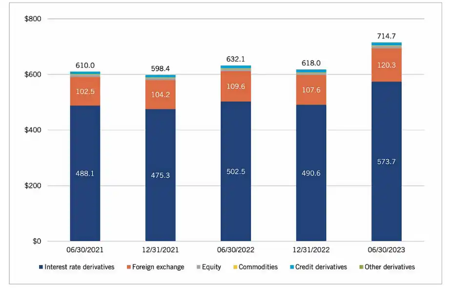 在 TradeFi 中,利率衍生品是在衍生品市场中占据市场大部分的头寸。并且,随着 TradeFi 的发展,衍生品市场的整体规模也在逐渐增大,截止 2023 年 6 月,整体衍生品市场的头寸已经达到了 714.7 万亿美元,而其中利率衍生品未平仓头寸达到了 573.7 万亿美元,占据了 80.2% 的份额。