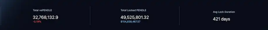 Pendle 从 YT 产生的所有收益中收取 3% 的费用。目前,该费用 100% 分配给 vePENDLE 持有者,而该协议不收取任何收入。除此之外,vePENDLE 投票者还有权从投票池中获得 80% 的利率互换费用,这构成了投票者的 APY。上图就是最新的投票情况,crvUSD pool 占据大约 44% 的投票权集中在这个池子。而截止 2024 年 3 月 7 日,目前锁定在 Pendle 上的总共有 4952 万枚,vePendle 作为一种投票权和权利的虚拟代币,共有 3276 万枚,平均锁定了 421 天。