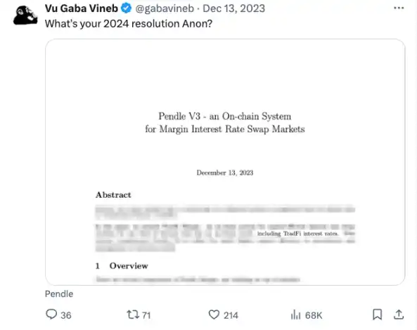 根据联合创始人 Vu Nguyen 发布的推特,Pendle 的 V3 版本计划在 2024 年推出,其包含了传统金融的利率衍生品,这将引起 tradeFi 的极大兴趣。具体的实现细节暂时未知。