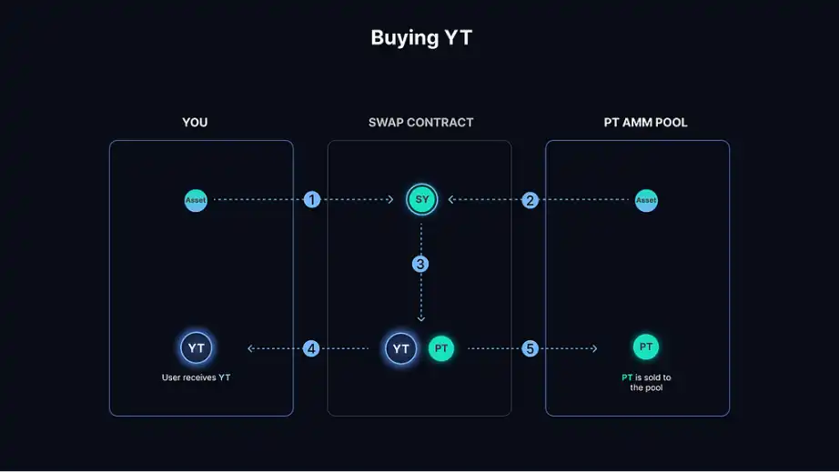 PT 和 YT 都可以通过 Pendle 的 AMM 进行交易,这是 Pendle 的核心引擎。在 Layer2 上,项目使用的预言机为 Redstone。Pendle 的 AMM 实现了高效的 DeFi 收益交易:想要赚取固定收益的交易者购买 PT,而想要做多收益的交易者则购买 YT。对于购买一段时间内的收益代币 YT,流程如下所示:
