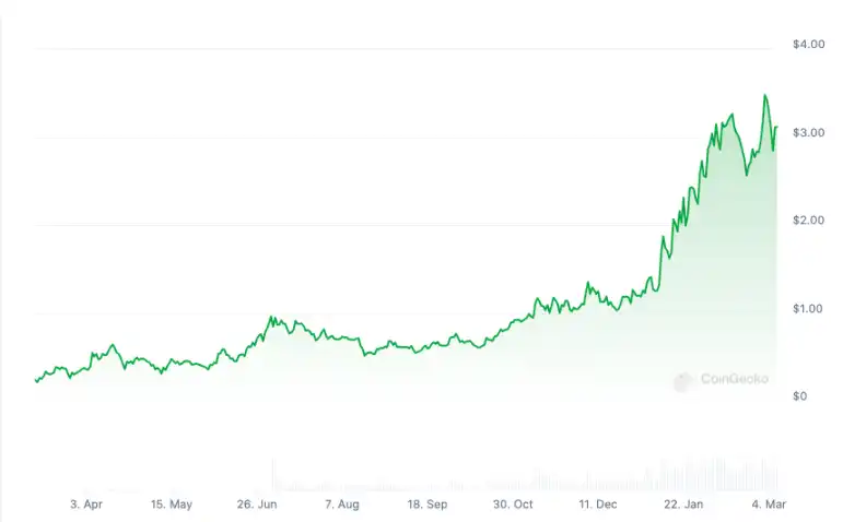 目前从币价涨势来看,其币价增长也符合 Staking 赛道的发展现状。目前币价已经到达历史新高的位置,但是其市值也才 3 亿美元(币价 3.11),全流通大约 8 亿美元,在 2025 年 5 月,由于释放机制的问题,FDV 实际上只能算 3 亿美元,因此我们认为该代币可能存在极大的上涨空间。