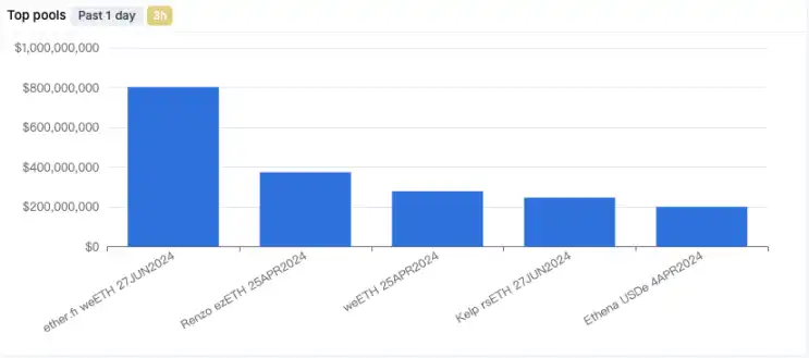 在所有池子中,主要是以 LRT 赛道的项目为主,伴随着 LRT 赛道项目的发币以及未来 Staking 赛道持续火热等因素,这个赛道将会成为行业的热门焦点,其增长率也会较高。目前主要的 LRT 赛道的 TVL 目前都处于增长阶段,这对主要池子是 LRT 的 Pnedle 有非常直接的促进作用。