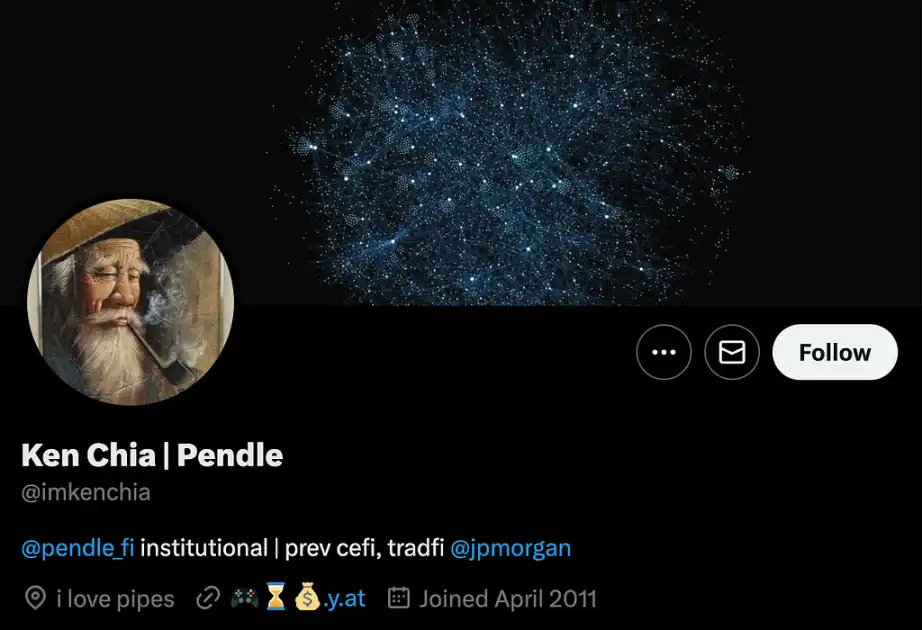 Ken Chia(X: @imkenchia):机构关系主管,获得莫纳什大学的学士学位,曾经在马来西亚第二大的银行 CIMB 担任投行实习生,之后在摩根大通担任私人投行的资产规划专家,2018 年进入 Web3,在一家交易所担任 COO,2023 年 4 月加入 Pendle 担任机构主管,负责机构市场 — —自营交易公司、加密货币基金、DAO/ 协议国库、家族办公室。