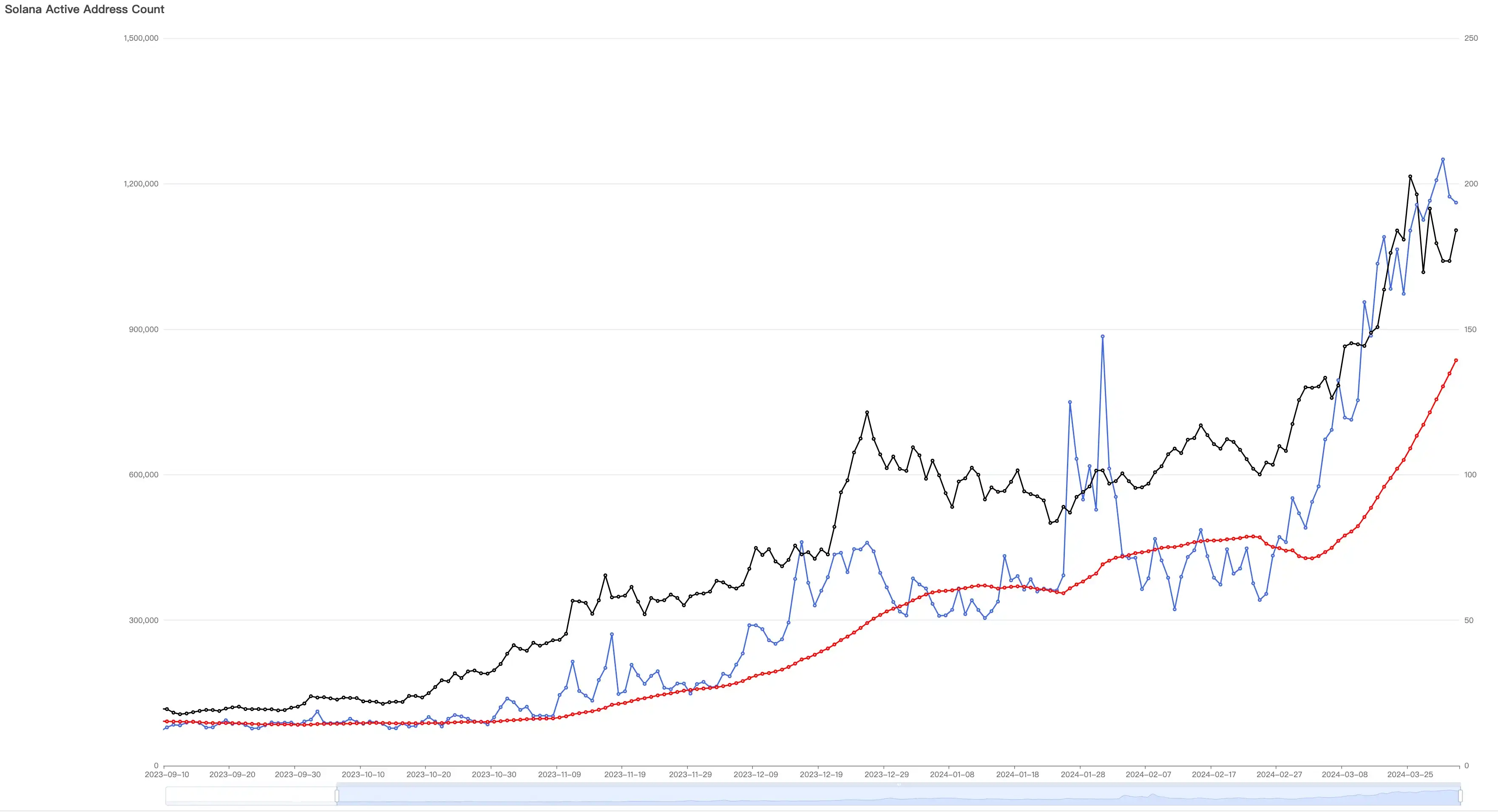 检视 Solana 用户新增统计图表,可以发现它呈现出非常完美的脉冲式增长态势。2023 年,其新增用户与价格持续缓慢增长,至 11 月中旬增长曲线斜率开始增大,由日新增 30 万左右提升至 1 月中旬的 160 万左右,足足增长了 4 倍多。此后,在 1 月下旬和 2 月下旬出现两次新增回落之后,整个 3 月都处于暴力增长之中,月初至月底 30 天内增长了接近 1 倍。