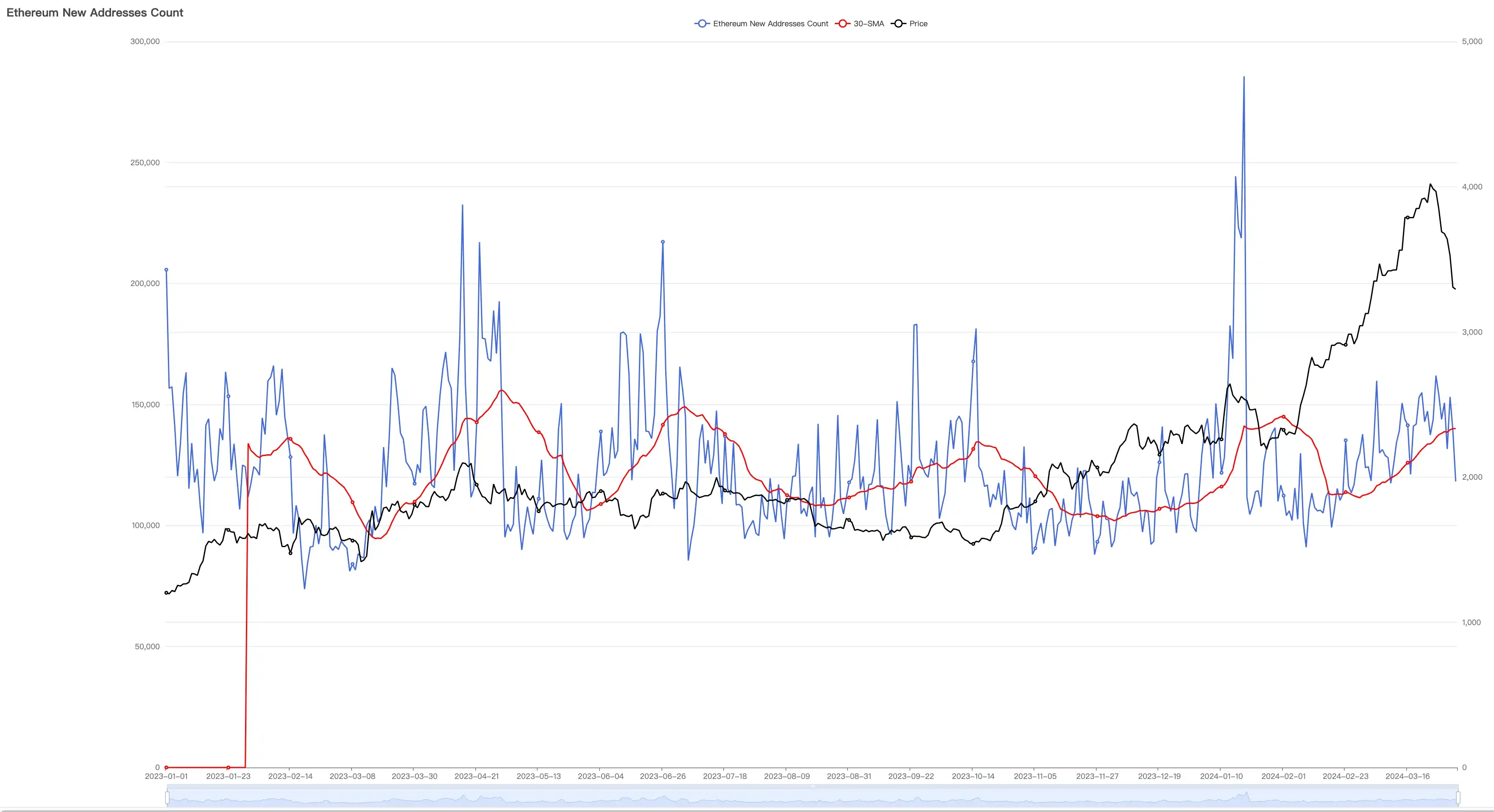 对于 Etherum 的数据表现,我们可以理解为牛市刚刚启动,主要还是存量用户的复苏与活跃,而规模性的新增用户尚未蜂拥而至。