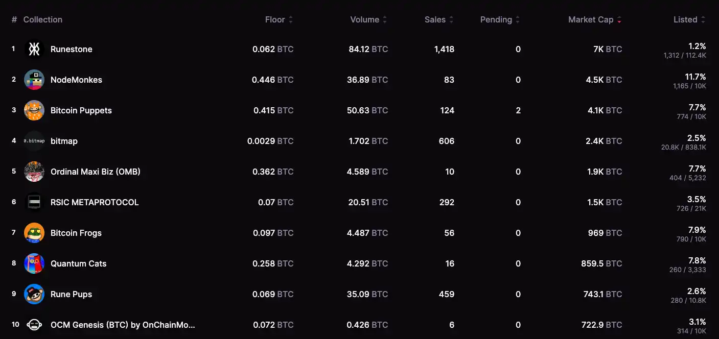 Runes 概念 NFT 的交易量和价格都在普涨。截止撰稿时间,据 magiceden 数据显示,交易量前十的比特币 NFT 中,包括 Runestone 在内有四个都是 Runes 概念的。