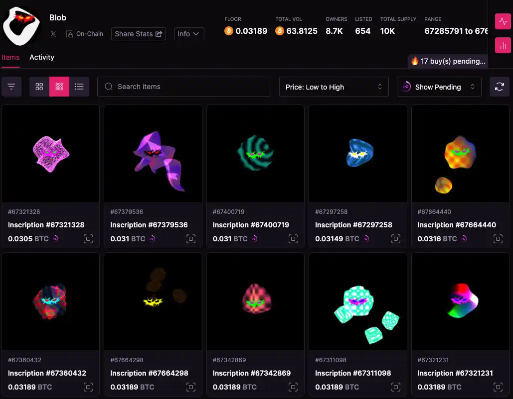 不只是 Runes 概念的 NFT,据 magiceden 最新数据,昨日空投上线的抽象风 NFT Blob 地板价也猛涨至 0.03,交易量仅次于 Runestone,24 小时交易量达 63 个比特币,在比特币 NFT 中排名第二。