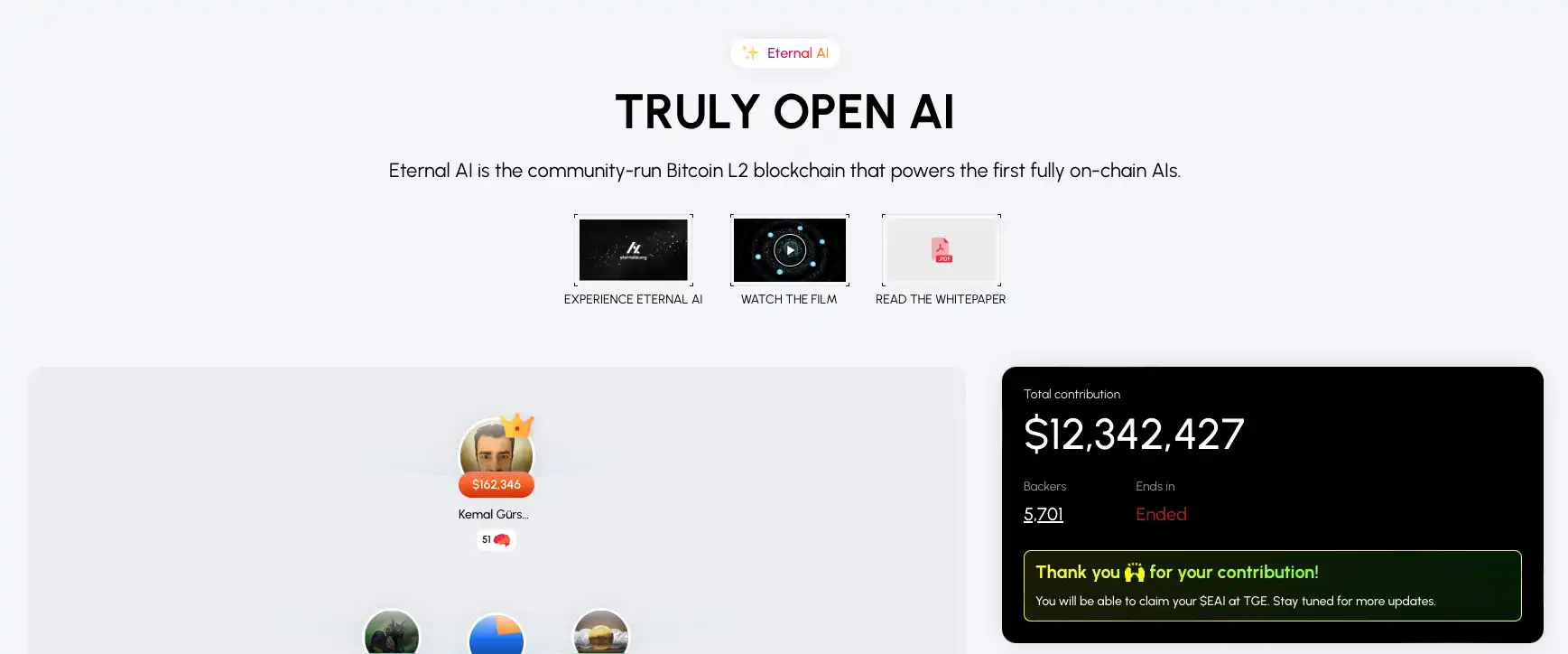 除 BVM 本身热度外,其分叉团队开发的基于比特币 L2 的 AI 项目 Eternal AI 也引发了社区的不少讨论。本月初,Eternal AI 在 NakaCahin 开启其代币$EAI 公售,根据官网显示,团队此次共募集了超 1200 万美元。