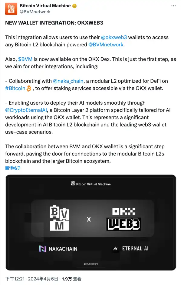 BVMnetwork 是一个比特币上模块化比特币 L2 协议,旨在打造即插即用的区块链模块以启动自己的比特币 L2 区块链。BVM 官方推特于 4 月 6 日发布推文表示,BVM 现已能在 OKX Dex 上交易,同时通过与 nakachain 的合作,提供可通过 OKX 钱包访问的质押服务。