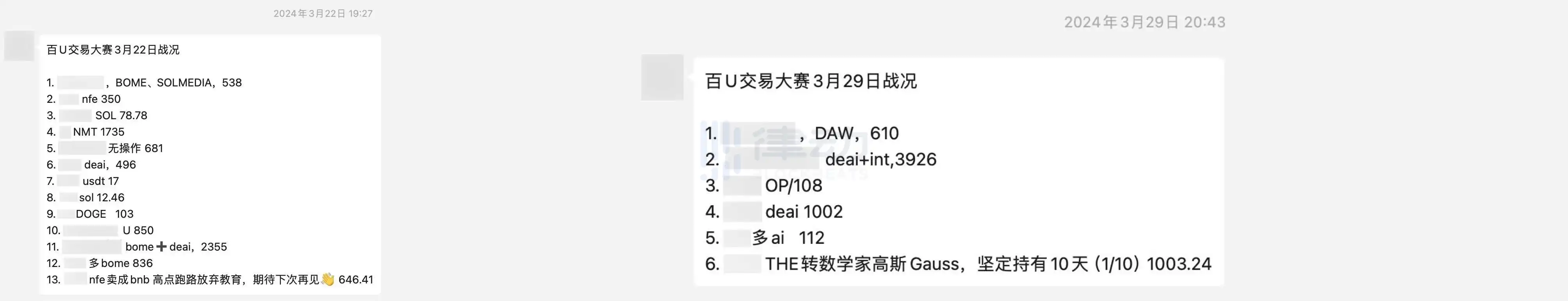 很多选手赶上了这一波,让投资回报开始出现差距。问及 0xcxr 为什么没有在 3 月 14 日将合约里的钱提取出来买 BOME,得到的答案是嫌麻烦,「meme 总是一阵一阵的,把握不住」,第二天整个市场再次震荡下跌时,0xcxr 的合约却迎来爆仓。但也是在这一天,0xhao 靠着在公布当天战绩之前买入 BOME 获得了超 250% 的回报。