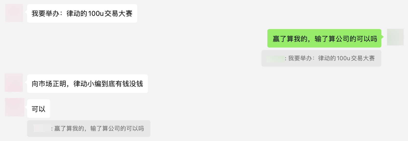 三月的某天,工作群里传出一张「嘲讽」小编没多少钱的截图(是的老板,确实没钱),便有了的第一届百 U 交易大赛,本打工人斗胆问了一句图中的话,怀着愉悦的心情报名了此次交易大赛。