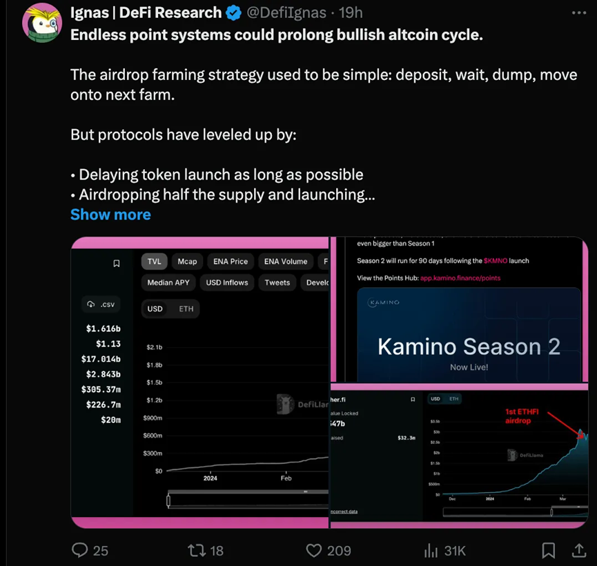 协议团队拥有永无止境的积分方案,可能会通过延迟代币生成 ( 和倾销 ) 事件,无意中延长这个看涨周期