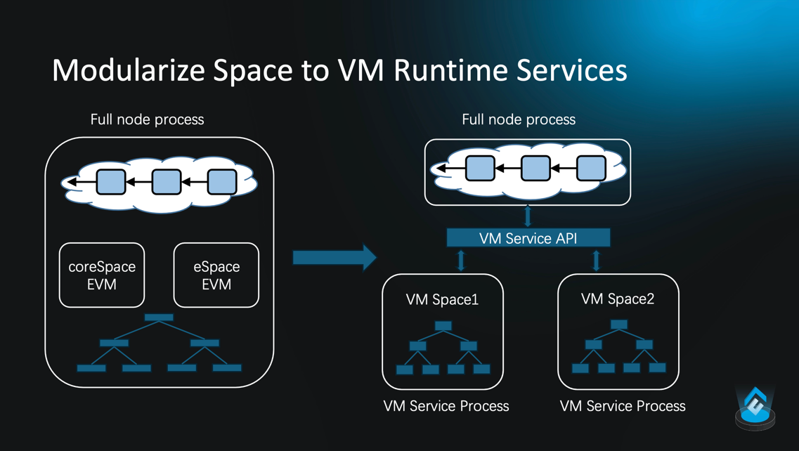 根据伍鸣博士的介绍,这个方案有两个优势,其一是可以实现网络安全性的螺旋式增强。在Conflux 网络中,通过PoS 节点轮换、DPSS 协议实现了现阶段的网络安全性及去中心化,以承载一定程度的BTC 资产跨链至Conflux 网络。同时通过内置的质押机制,BTC 资产持有者可以参与Conflux 的网络治理以及网络安全维护,从而提升Conflux 的网络安全性。随着安全性的提升,网络对跨链资产的容量随之提升,更多的BTC 资产进入Conflux 网络后,更高的网络安全性得以实现。这种网络安全性的螺旋式增强,最终可以实现Conflux 网络达到比特币网络同等的安全性,在性能上却远高于比特币网络。其二,通过设置虚拟机服务的API,将Virtual Space 从全节点进程中剥离,置于独立的虚拟机服务进程中,为第三方团队和开发者在Conflux 网络上部署新的虚拟机创造条件,完成比特币网络layer-3 的开发过程,实现比特币生态在比特币网络外的繁荣,同时完成对Conflux 网络的安全机制进行模块化的扩展。通过这种形式,Conflux 将不局限于仅作为比特币的layer-2,而会成为比特币网络的第一个layer-3 扩容范例。
