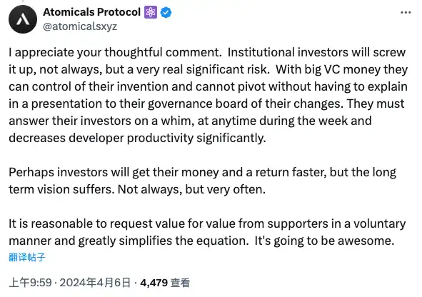 作为比特币生态中「清真」度极高的实验性协议,Atomicals 协议官方表示永远不会推出筹款代币,也不会推出任何类型的证券,更不会接受 VC 机构的投资,从而保持协议的纯粹性。