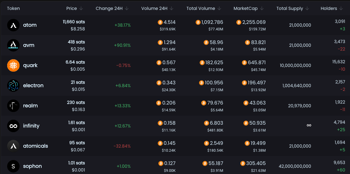 同时伴随着比特币四月减半倒数计时,比特币生态整体又都重新「夺回」了市场的关注度和流动性。从比特币 NFT 到铭文生态再到 Runes 协议,比特币上各种资产的交易量和价格都有了很大的增长,Atomicals 协议的几个头部资产涨幅都不错,社区的氛围也有所好转,似乎有回到几个月前的热情状态之势。