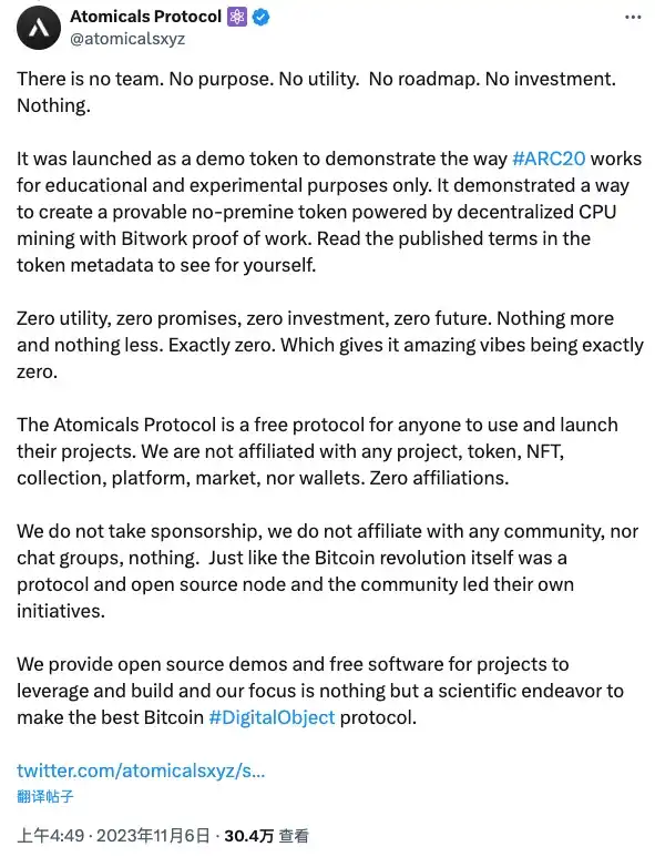 官方表示 Atomicals 没有团队,没有目的,没有实用性,没有路线图,没有投资,没有什么