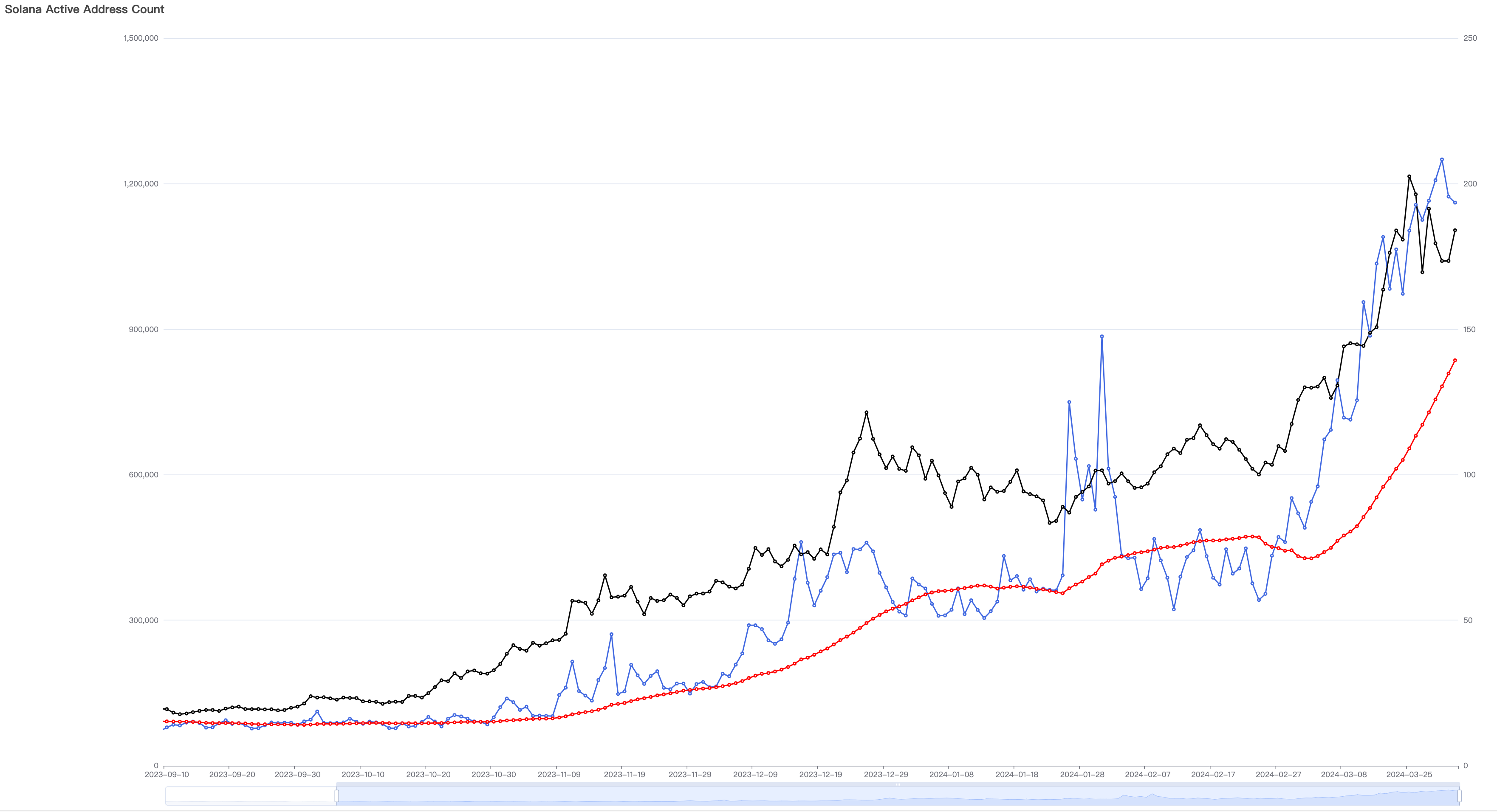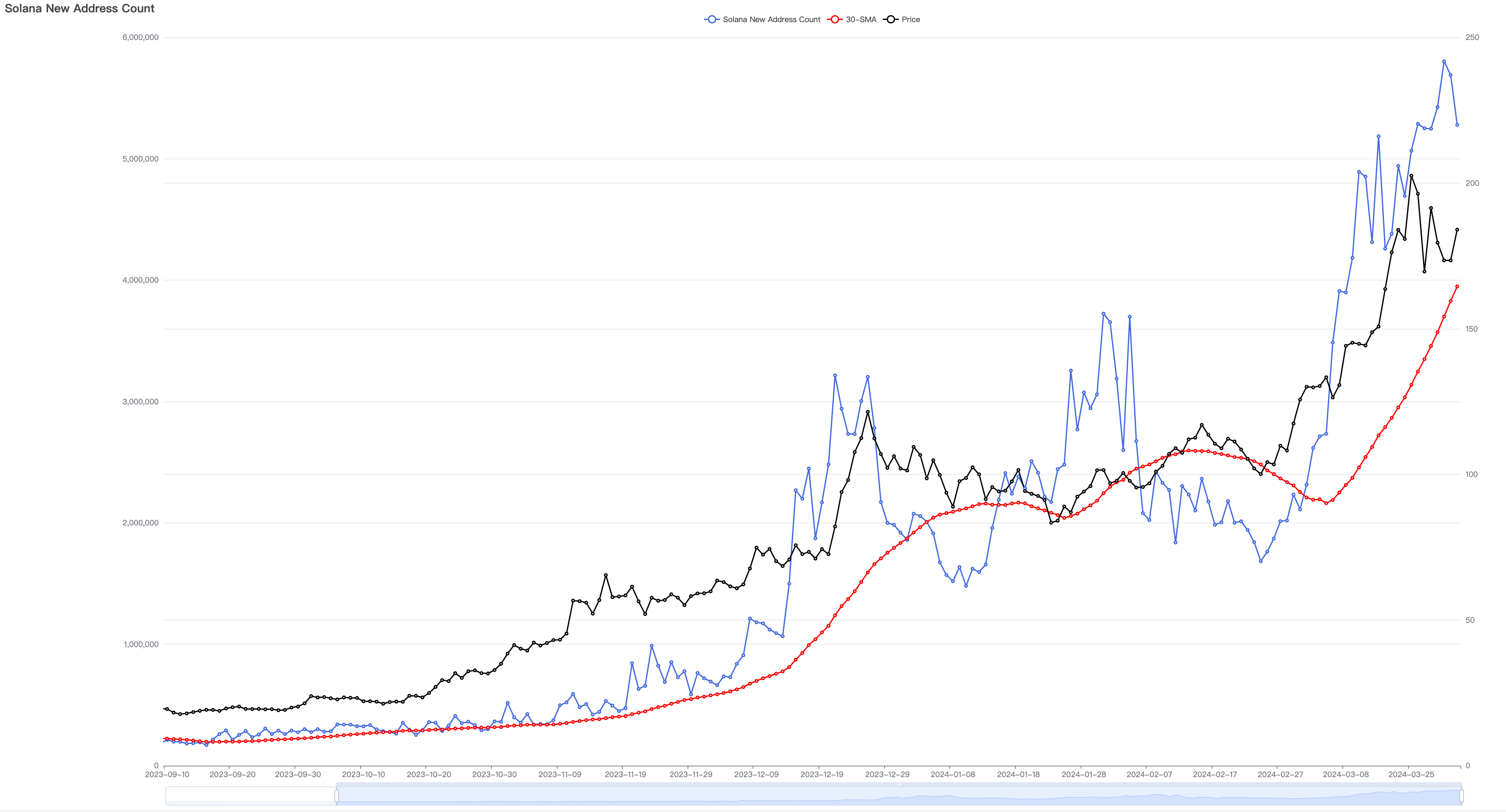 检视 Solana 用户新增统计图表,可以发现它呈现出非常完美的脉冲式增长态势。2023 年,其新增用户与价格持续缓慢增长,至 11 月中旬增长曲线斜率开始增大,由日新增 30 万左右提升至 1 月中旬的 160 万左右,足足增长了 4 倍多。此后,在 1 月下旬和 2 月下旬出现两次新增回落之后,整个 3 月都处于暴力增长之中,月初至月底 30 天内增长了接近 1 倍。