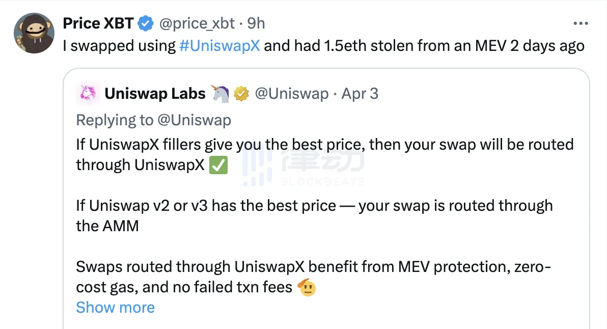 另外,由于产品处于早期阶段,市场上对 UniswapX 的讨论热度和使用强度均不高。甚至还有用户在社交媒体上表示,自己在使用 UniswapX 交易后,仍旧遭到了 MEV 攻击,不过该用户反应的情况并未得到进一步的证实。