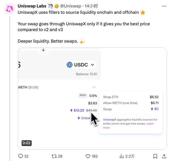 4 月 7 日,据官方公告,Uniswap 网页版已正式上线 UniswapX,次日 Uniswap Labs 官方推特发文表示,用户已经可以在 Uniswap 网页应用上体验到 UniswapX 带来的「零 Gas」「防 MEV」链上交易体验。自去年 7 月上线测试网版本以来,备受市场期待的 UniswapX 在历时八个月后终于与用户见面了。