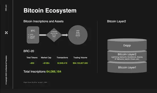 当然,更值得关注的是,基于比特币的 UTXO、SegWit 等技术以及 Taproot 升级,以及 Ordinals、Atomicals 等协议为 BTC 的 NFT、Token 的等资产的发行构建了底层基础设施。截至 2024 年 4 月 1 日,根据 OKLink、Dune 与 brc-20.io 的数据统计:铭文的总量为 64,066,164。