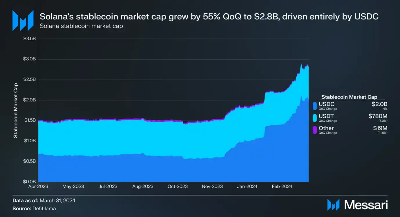 继上季度增长 21% 之后,Solana 的稳定币市值环比增长 55%,达到 28 亿美元,在所有网络中排名第五。这一增长完全是由 USDC 推动的,其 Solana 市值环比增长了 111%,达到 20 亿美元。Solana 现在拥有的 USDC 数量仅次于以太坊,排名第二。