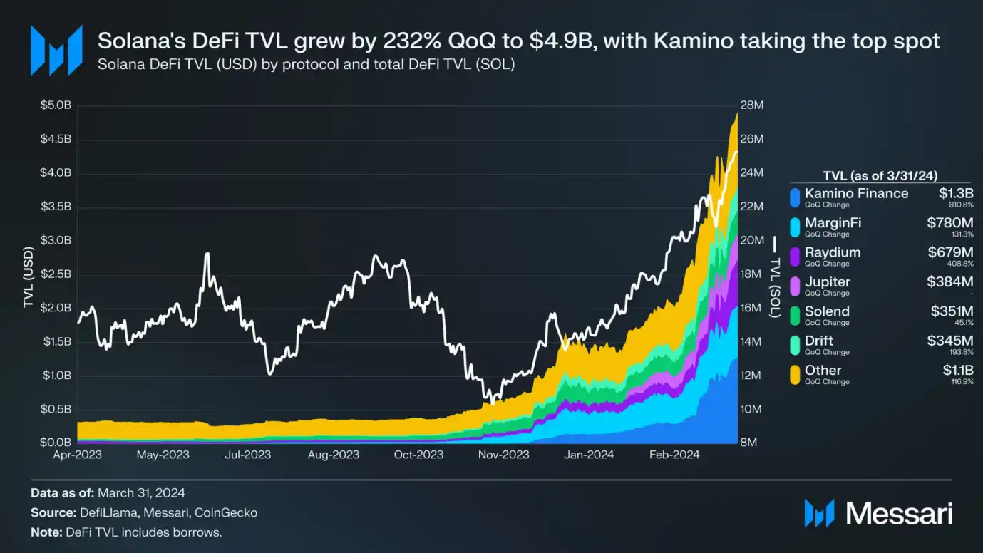 Solana DeFi TVL 环比增长 232%,达 49 亿美元,在所有网络中排名第四。借贷和收益协议 Kamino 从 Solana 第四大协议跃升至 TVL 榜首。其借贷协议在本季度结束时获得了近 13 亿美元的 TVL,环比增长 811%。