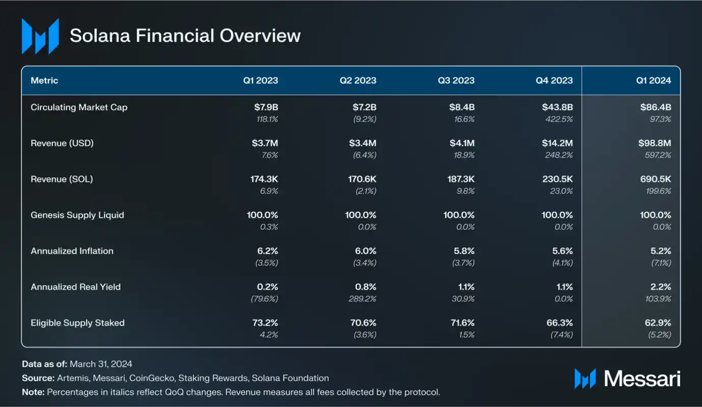 SOL 市值继续处于市场的领先地位。其市值在所有代币中排名第五,仅次于 BTC、ETH、USDT 和 BNB。在上一个周期达到 770 亿美元的峰值后,SOL 市值继续达到历史最高水平。截至 24 年第一季度,市值为 864 亿美元,环比增长 97%。然而 SOL 距其近 260 美元的历史高点还有约 25% 的差距。