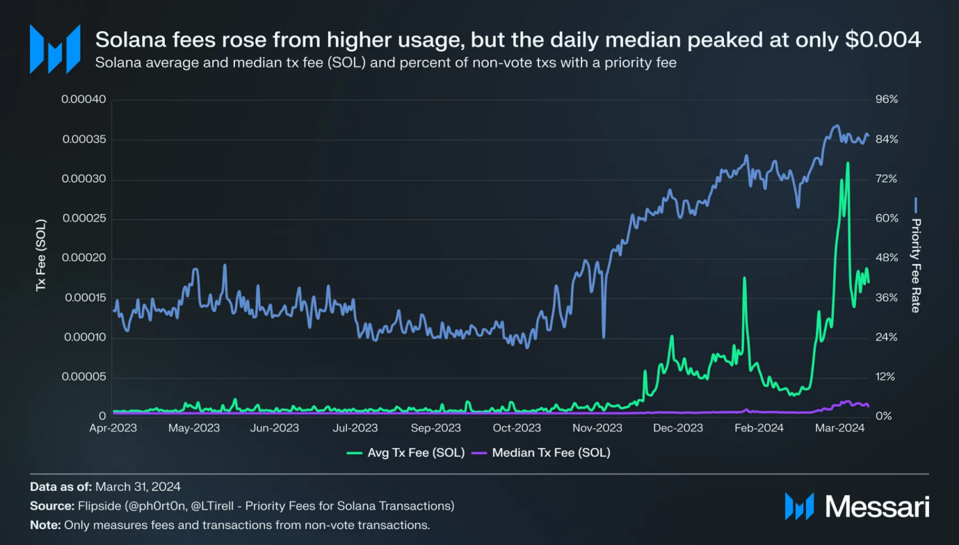 以非投票交易和付费交易衡量的网络活动在第一季度继续上升。日均付费用户环比增长 214%,达 59.7 万人,在 3 月 17 日达到 200 多万人的峰值。地址数的增长主要是由 Memecoin 交易推动。日均非投票交易量环比增长 71%,达 7000 万笔。然而,62% 的非投票交易失败,环比增长 10%。失败的交易大多来自套利机器人或 DEXs 上的用户交易。