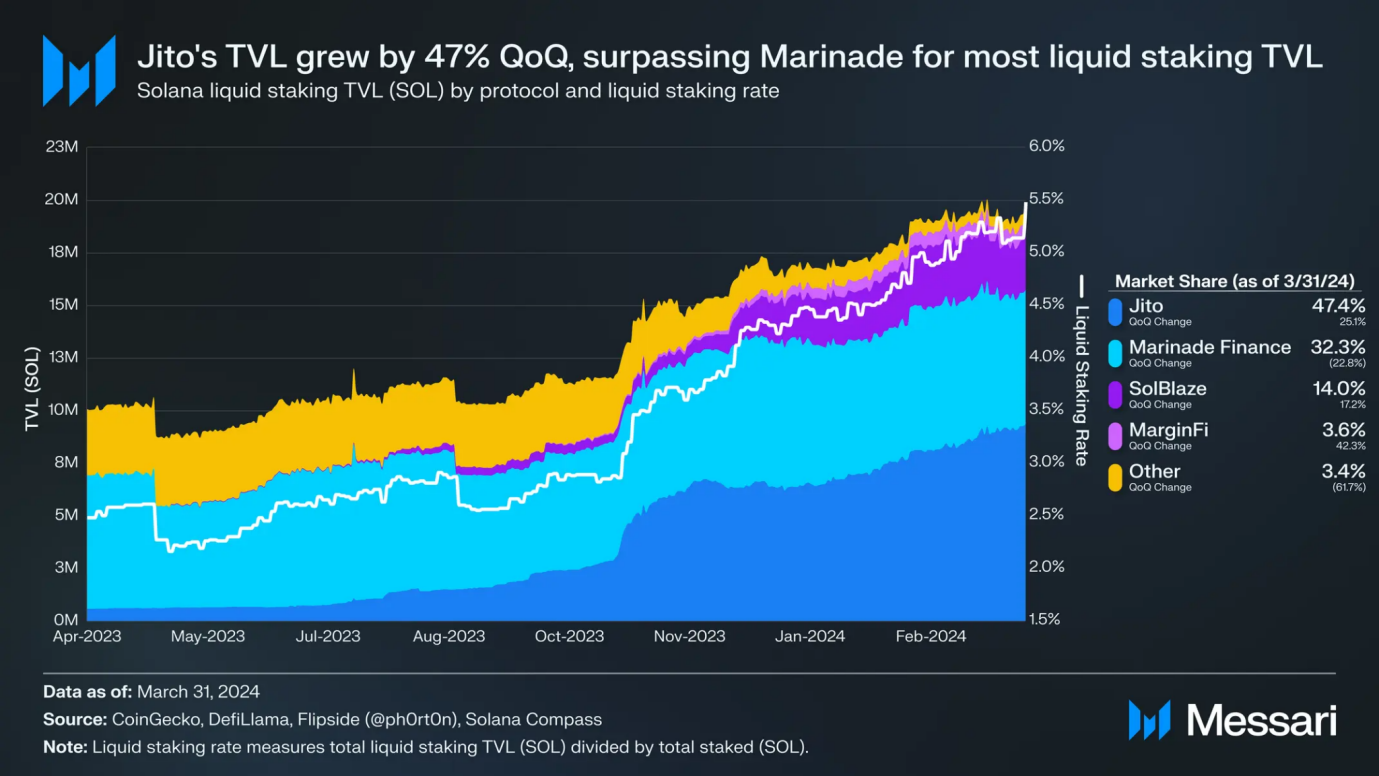 Solana 的流动性质押率环比增长 27%,达 5.5%。流动性质押协议 Jito 在增长方面一直处于领先地位。Jito 的 TVL 环比增长 47% 至 940 万 SOL,取代了 Marinade,TVL 排名第一。本季度末,Jito 的流动性质押市场份额接近 50%。Marinade Liquid 的 TVL 环比下降了 9%,降至 640 万 SOL。Blaze 的 TVL 环比增长 38%。