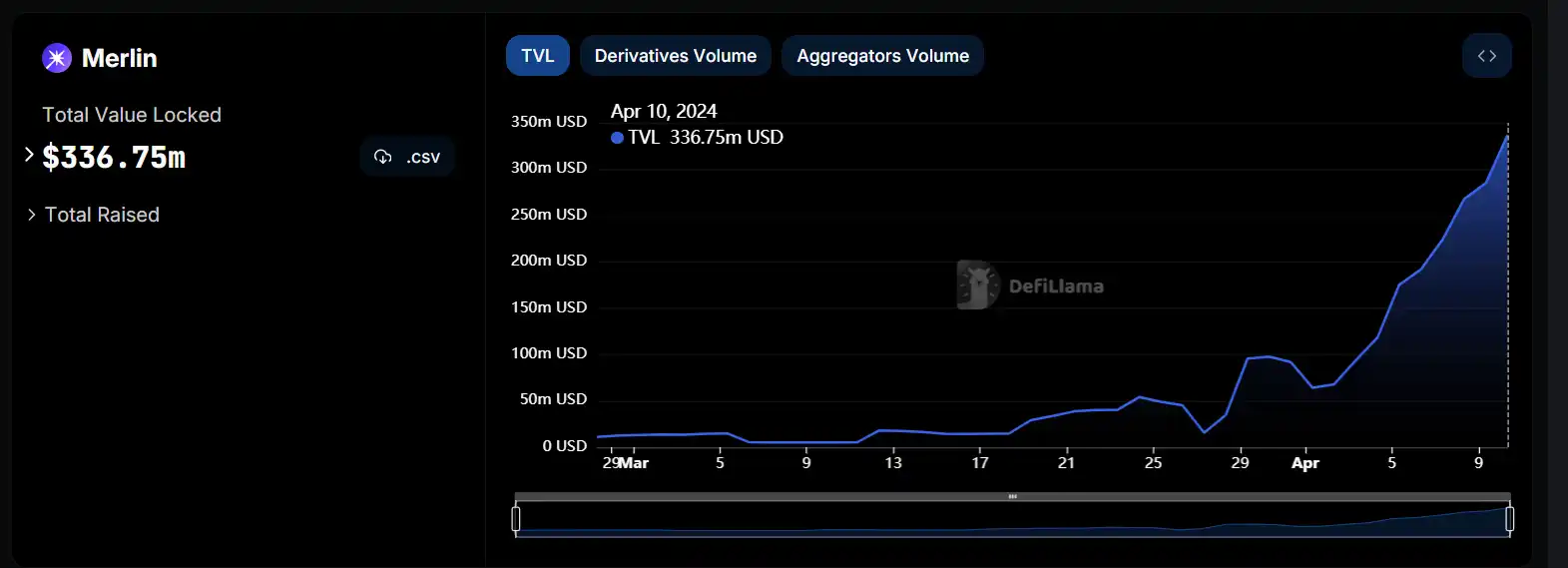 作为 BTC L2 的大热门项目,Merlin Chain 的 TVL 一直在增加,截止撰稿时已达到 3.3 亿美元。