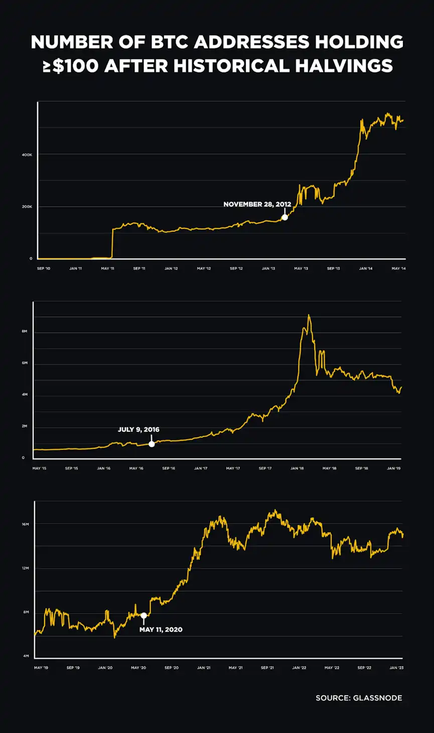 除了与价格相关的影响和更多的关注 ( 部分是通过这些影响 ) 之外,减半还与采用指标的深刻、长期增长有关。比特币在减半前和减半后的知名度提高,刺激了更多的新来者探索并可能购买数字货币,从而有助于扩大其用户群。