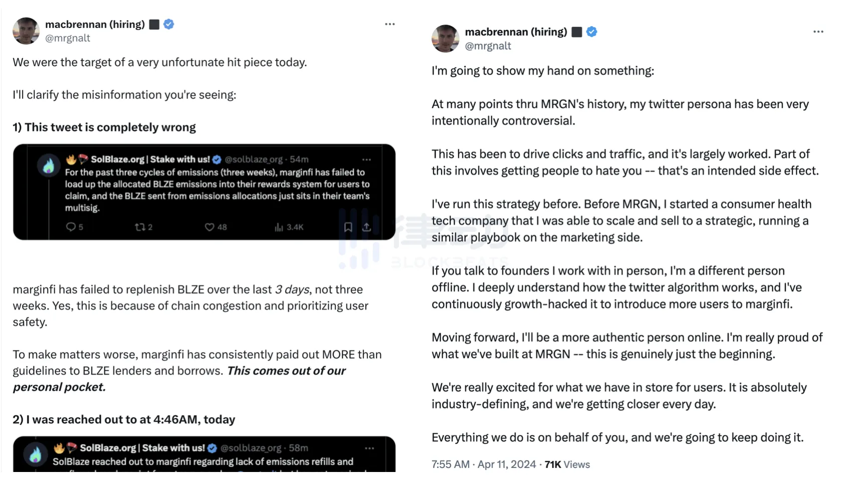 创始人发文出走团队对一个正处于上升态势的项目来说无疑是沉重的打击,虽然 Edgar 没有指明具体何事导致团队破裂,但社区普遍将其离职与此前 SolBlaze 指控 Marginfi 的动态联系在一起。