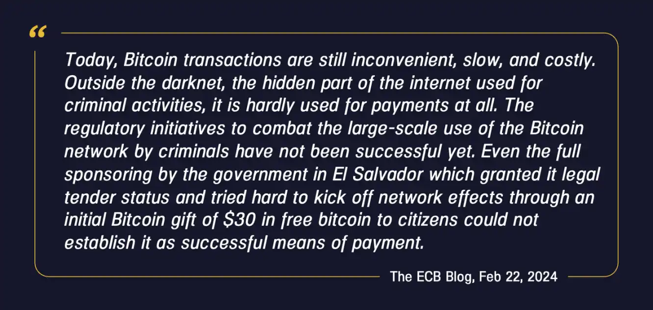 欧洲央行观点 1:除了暗网犯罪活动之外,比特币几乎不用于支付。