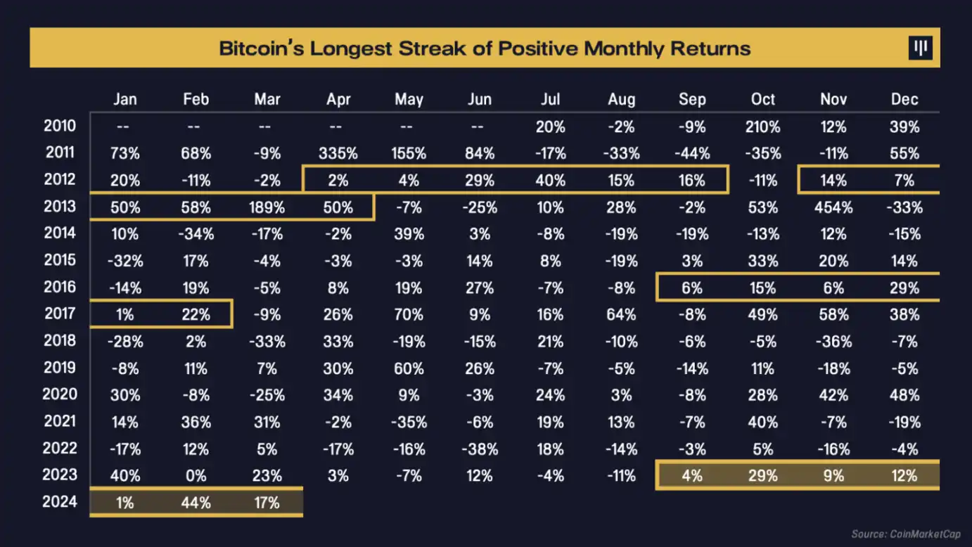 此外,比特币还创下了历史上最长的连续七个月表现良好的记录。此前最长的连涨期为六个月,在过去 14 年中出现过三次。