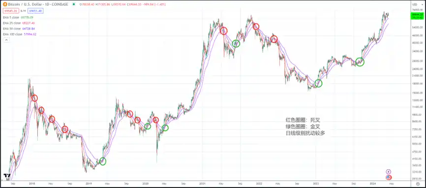 实操中会发现,其实咱们这个市场是牛长熊短的,真正意义上空头排列完全形成并持续下跌的熊市,其实只有几个月。此外,虽然「金叉」和「死叉」会早于均线形态确认,但相对来说出现次数更多,扰动也多一些,但这种扰动,其实也对应着行情和多空力量博弈的反复,以及牛熊周期的多次卖点和买点。不可能做到精准摸顶和摸底,那么就多试几次。