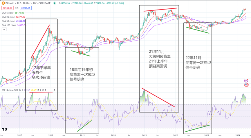 就大周期来说,周线级别的 RSI 背离更有参考意义,因为这个信号出现的频次相对较少,基本就 1-2 次,因而干扰少一些,而日线级别的 RSI 背离出现频次较多,对应的往往是阶段性的回调,而非反转。以 BTC 为例: