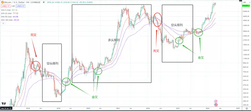 由于均线形态存在「滞后」性,因而建议周线、日线相互辅助验证。我们依旧以 BTC 为例: