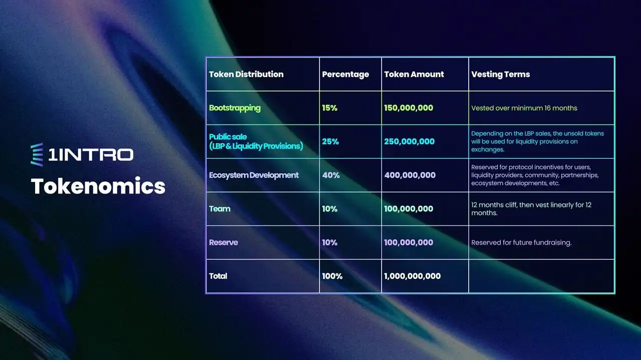 INTRO 总供应量为 10 亿枚,其中 2.5 亿枚参与公开发售,1.5 亿枚用于 Bootstrapping(16 个月内归属),1 亿枚代币分配给项目团队(12 个月线性归属),4 亿枚代币用于项目生态系统或活动奖励(每月解锁 5%),剩余 1 亿枚保留。
