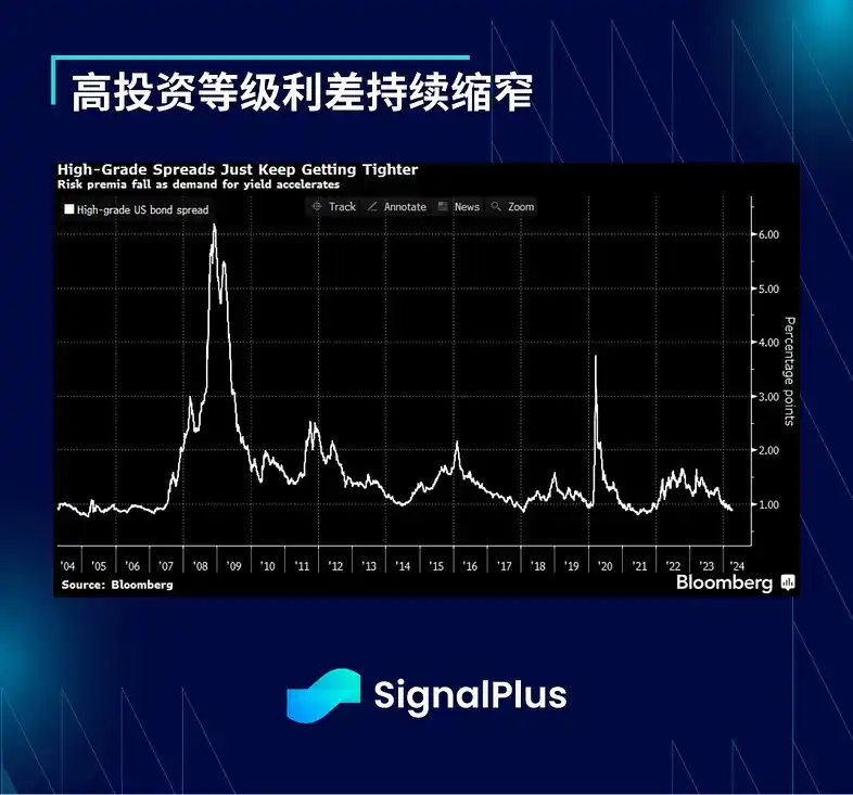 企业债也出现了类似的现象,市场对于放缓量化紧缩(放缓缩表)的预期带来更多企业债买盘,从而使高投资等级债券利差保持在历史低点。
