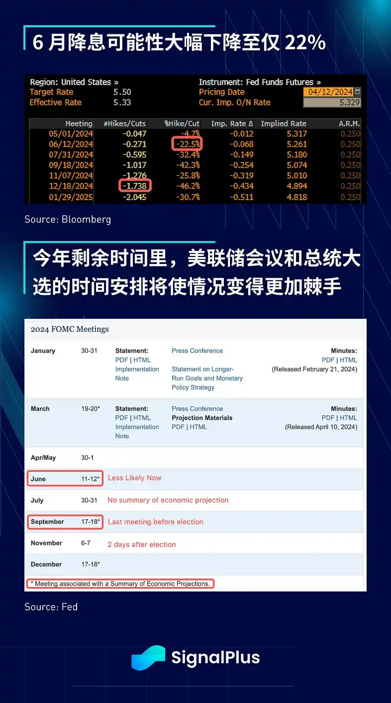 6 月降息的可能性已降至 22.5%,定价反映的全年降息预期目前不到 2 次。此外,考虑到今年剩余时间里美联储会议的时间安排,事情也变得更加棘手。