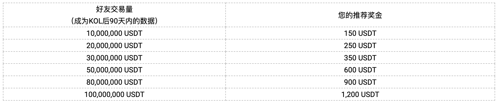 3.成功推荐好友成为火币HTX的KOL,且90天内交易量不少于1000万USDT,作为推荐人可额外获最高1,200 USDT的推荐奖金。