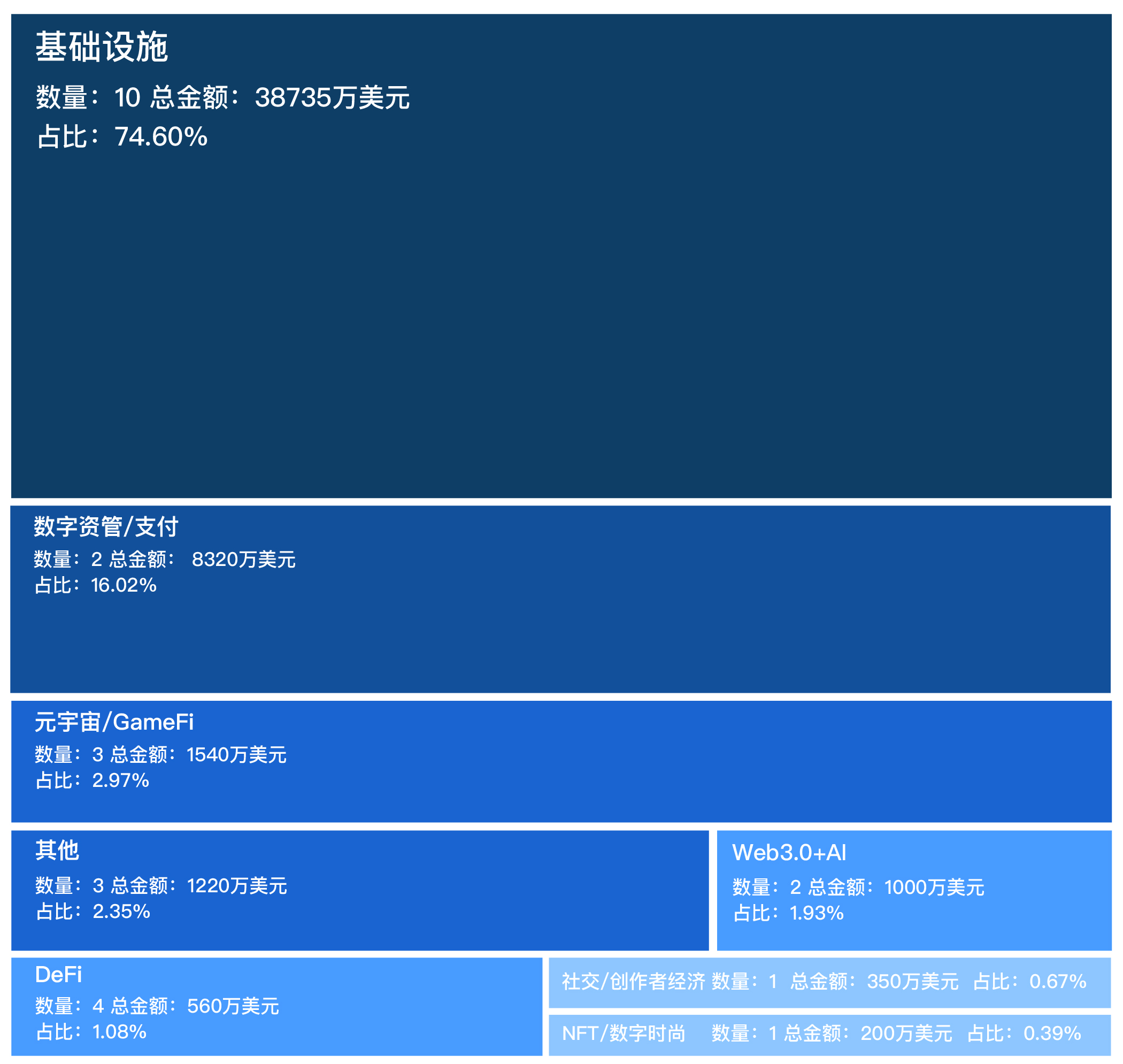 据 统计,上周的融资总数为 26 笔,数量较之前减少,总金额约为5.1925 亿美元,平均融资金额为 1997.12 万美元。其中,基础设施领域占据主体,数字资管/支付领域和元宇宙/GameFi 领域相对较多。下图为上周各板块融资占比: