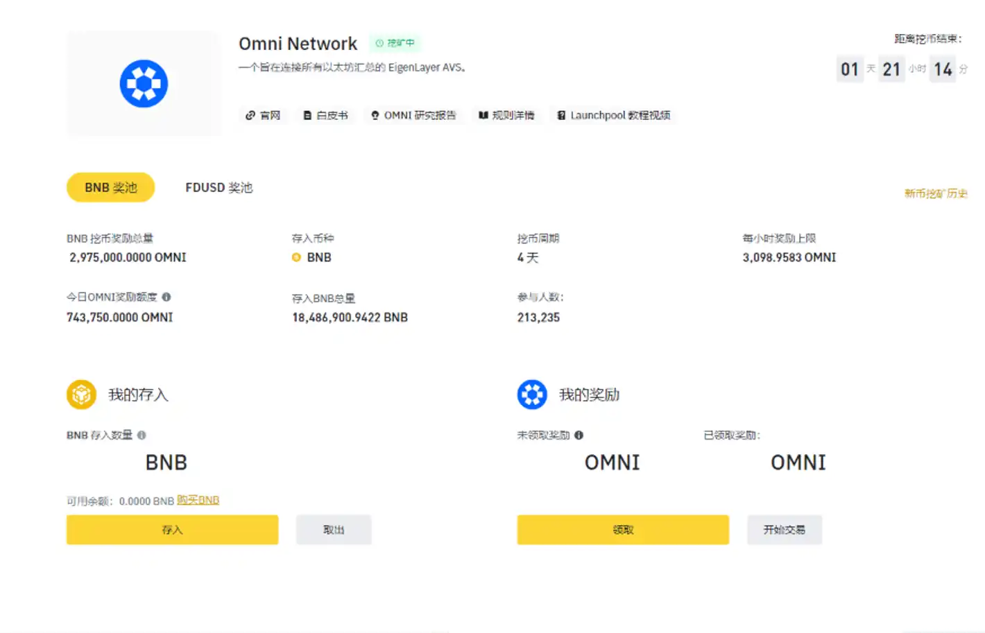 $OMNI 将于 2024 年 04 月 17 日 20:00(东八区时间)上线币安现货,目前可以在 Binance launchpool参与挖矿,此次挖矿周期为 4 天,参投 BNB 也达到了 18486900 个 BNB,早期参与的真是又吃又拿。