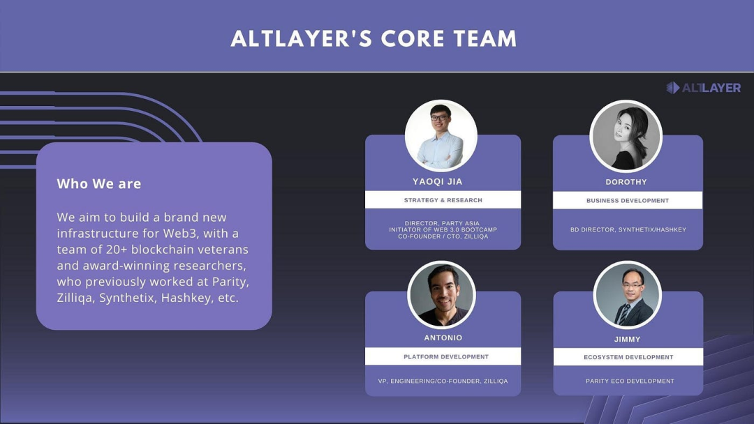 AltLayer 由 Zilliqa(第一个实现分片的区块链网络)前联合创始人、Parity Asia(区块链基础设施服务公司)前总经理贾耀琪及其团队 20 余名成员创立。