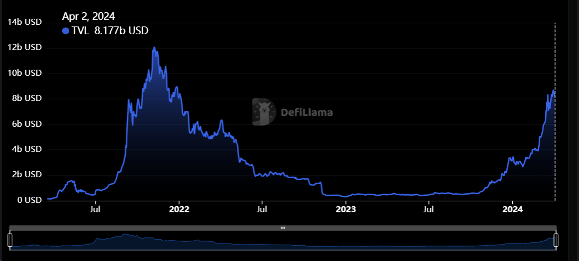 (Solana TVL 随时间变化图表,来源:DeFiLlama)