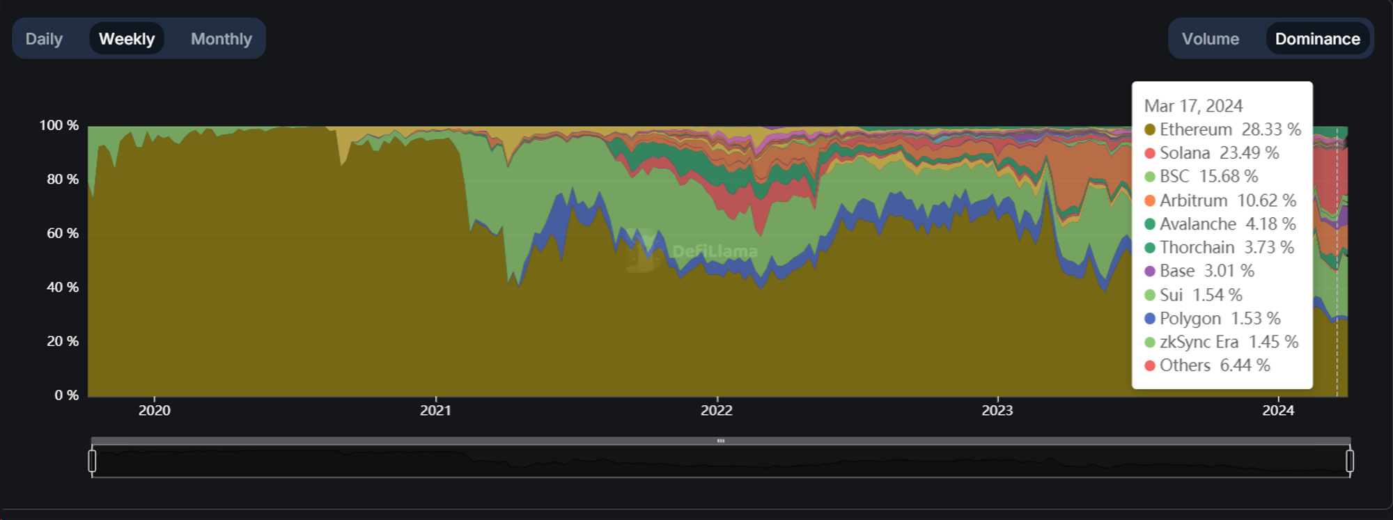 (各公链 DEX Volume Dominance 随时间变化图表,来源:DeFiLlama)