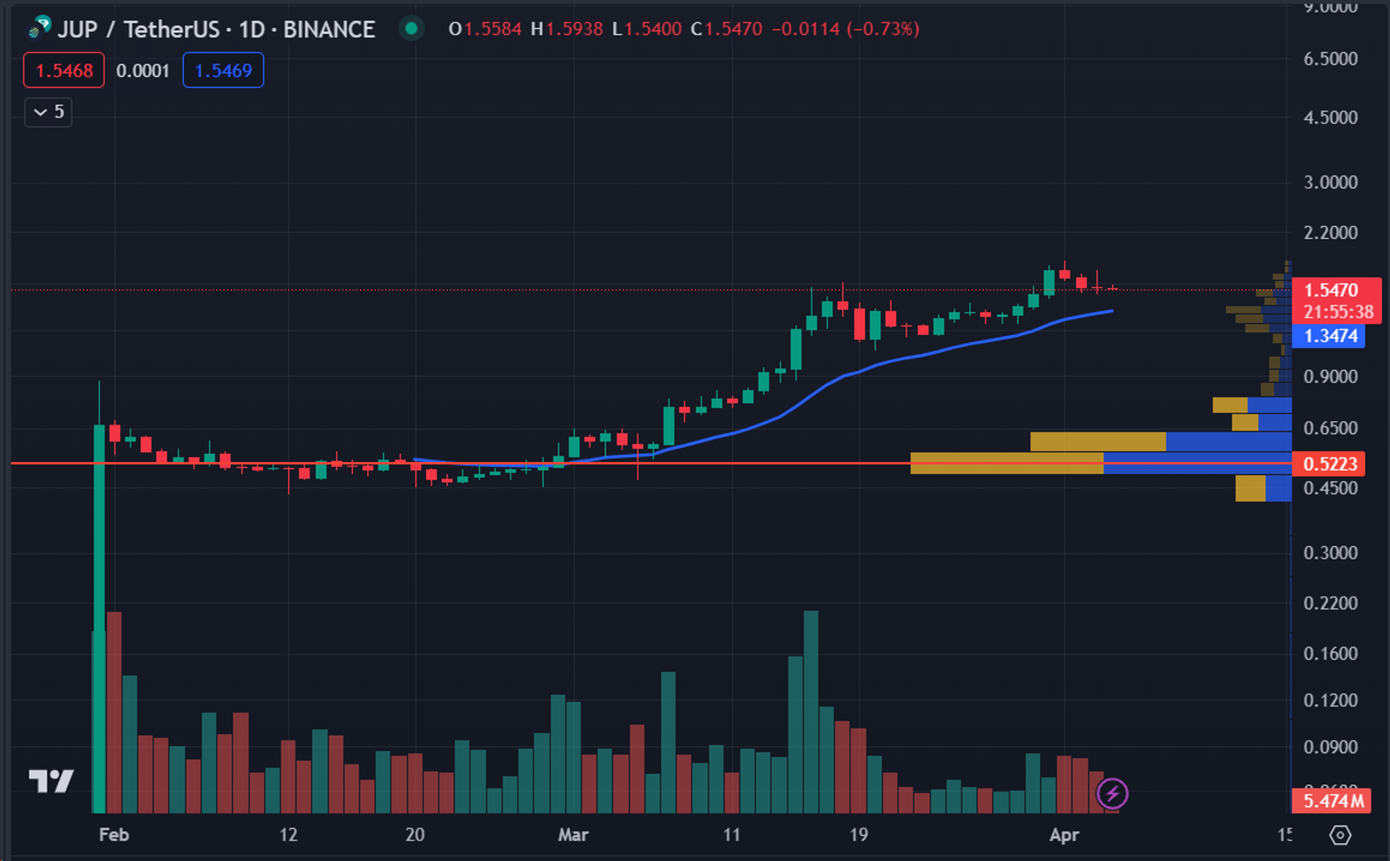 JUP 的交易主要集中在币安上,其次为 OKX、Bybit 和 Gate。根据在币安上的交易数据,JUP 在 0.5 左右的价格上维持了较长的时间,并在 0.5-0.7 的价格中完成了大量的换手,是 JUP 的密集成本区间,成为了较强的支撑,JUP 的价格在沉淀 2 个月后开始突破底部成本区间,目前已经进入了新的价格区间。