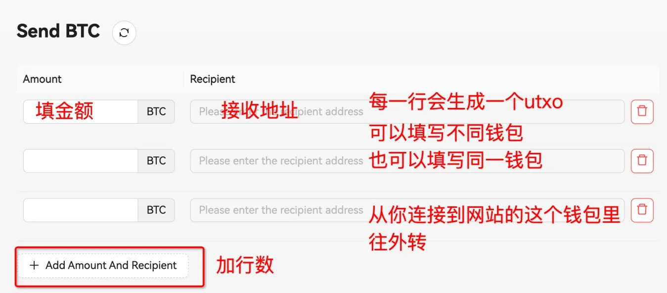 2. 按照你的需要,填写金额和接收地址。每行会生成一个打到对应地址的 UTXO